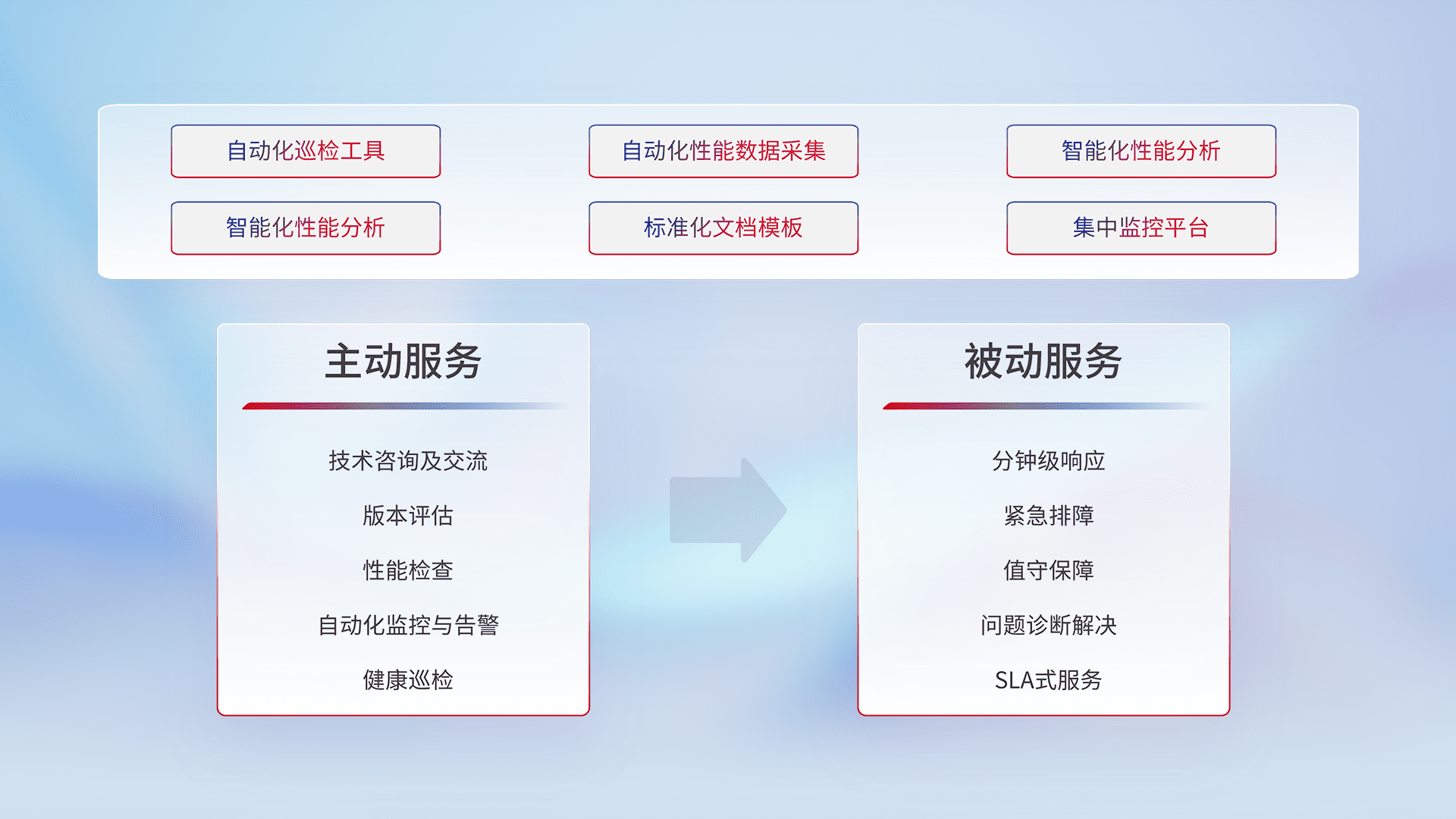 智能化工具和标准化文档,,保障服务质量,,提供主动服务(包含技术咨询、、版本评估、、、性能检查、、自动化监控与告警、、健康巡检)和被动服务包含(分钟级响应、、、、紧急排障、、、值守保障、、、、问题诊断解决、、、、SLA服务)。。。