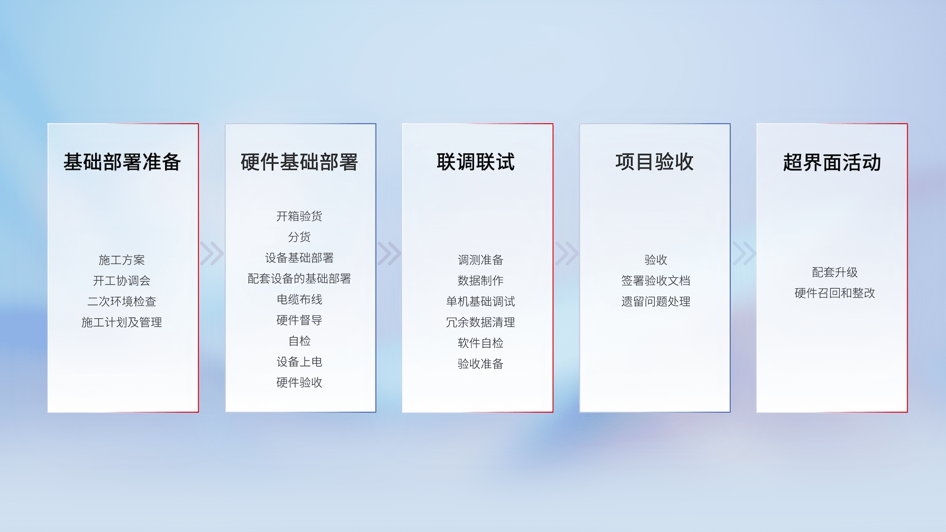 从基础部署准备、、、、硬件基础部署、、、联调联试、、项目验收、、越界面活动的全过程可追溯,,,,保证施工质量和进度。。。。